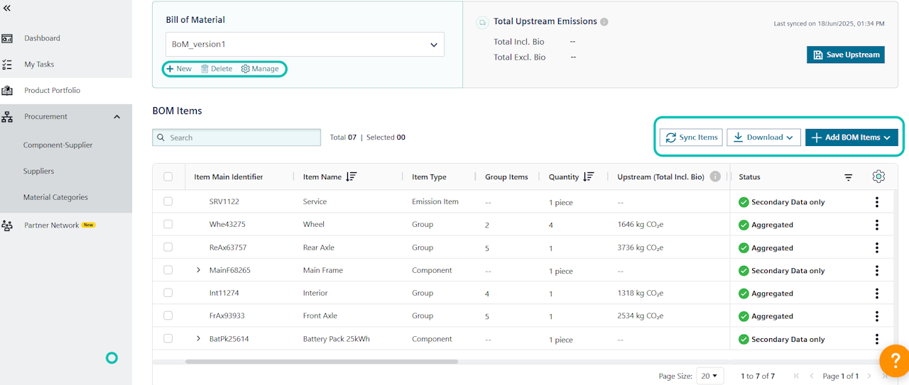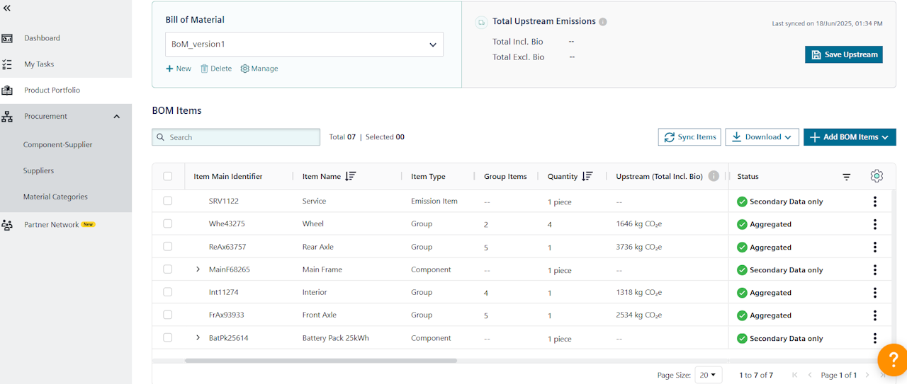 If you have received or added new values for your components, by clicking on Sync Items button on the right side, you will be able to update the aggregation. The latest component data from your procurement area will be reflected. If a PCF of one of your components changes, i.e. because a supplier has submitted an updated PCF, the upstream emissions will be recalculated.