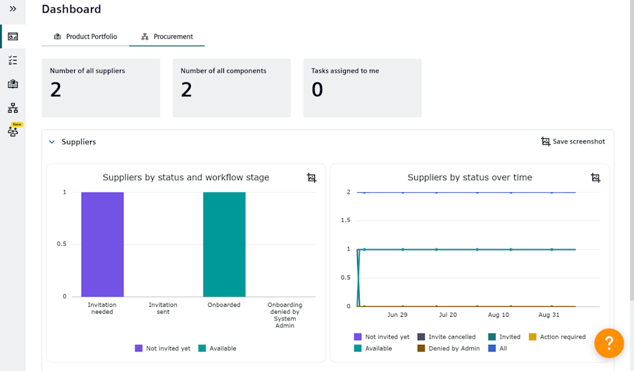 The procurement dashboard provides both component status and task tracking in a single view. Component information is grouped by emission data availability, while tasks are displayed in dynamic charts to show progress and workflow over time. These updates help clarify current procurement activities and data completeness.